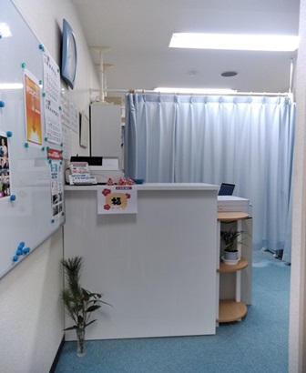 入ってすぐに受付デスクが見えます。奥が治療室、右側に待合室ソファがあります。