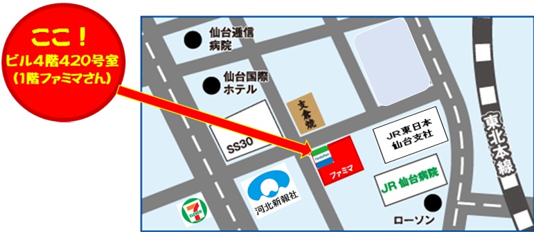 仙台駅から歩いて約10分です。ゆっくり歩くと15分かかる場合があります。迷ったらお気軽にお電話ください。